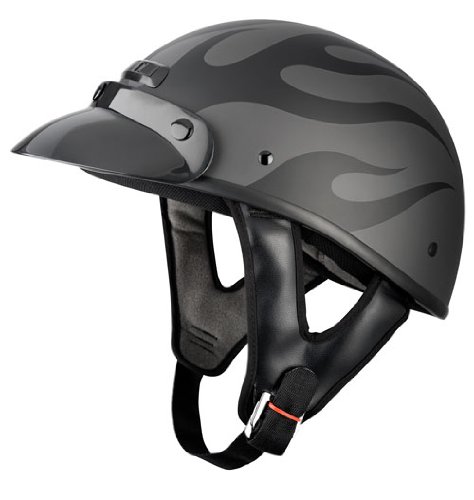 Raider Medium Flame Shorty Helmet - Protect your head and do it in style while wearing this Raider shorty helmet. It is lightweight and won't be a bother you while you are riding. The snap on/off visor is a plus in the summertime.
